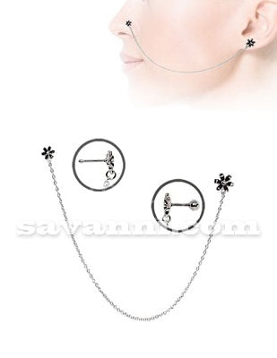 Upea statement-koru korvalehteen ja rustoon. Korussa kaksi lävistystappia, paksuus 1.2mm ja pituus 6mm tai 8mm. Pallot irtoavat tapista kierteillä, pallojen koko 4mm. Tapit yhdistuvat kahdella eri paksuisella ketjulla, toisessa päässä roikkuu suuri ristiriipus. Riipuksen koko 20mm, Ketjujen pituus noin 53mm. Saatavilla eri värejä.