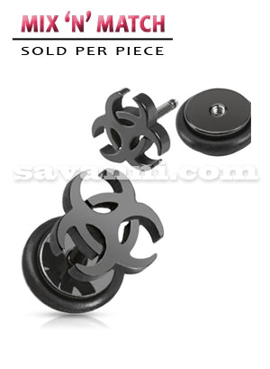 Feikkiplugi mustalla biohazard-kuviolla. Plugikorvakoru sopii käytettäväksi tavallisessa korvareiässä.
