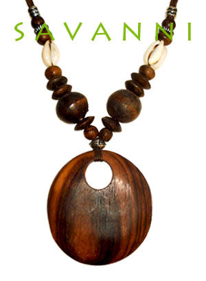 Boheemi kaulakoru helmikoristeilla, puuvillanauhoilla ja isolla puuriipuksella. Valitse puukaulakorun puuvillanauhojen väri valikosta.