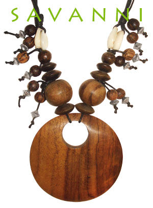 Kaulakorun riipuksen materiaali on puuta ja kaulanauha puuvillaa.