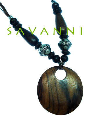 Kaulakoru mustalla säädettävällä kaulanauhalla ja puisella ruskealla spiraali -riipuksella.
